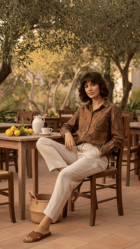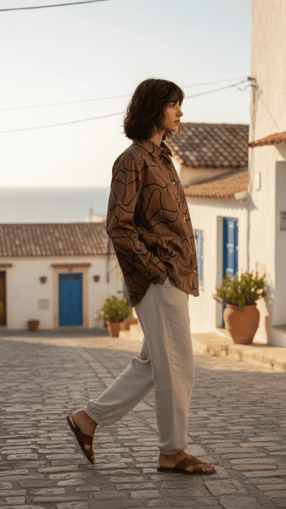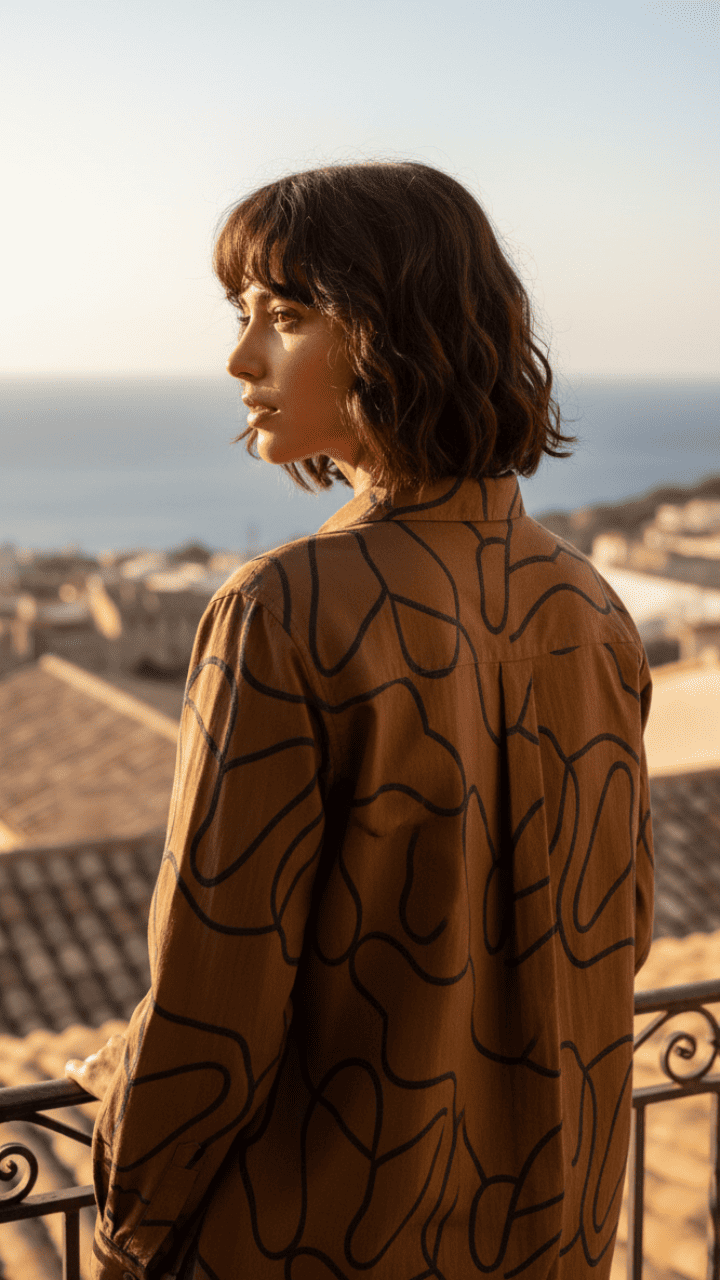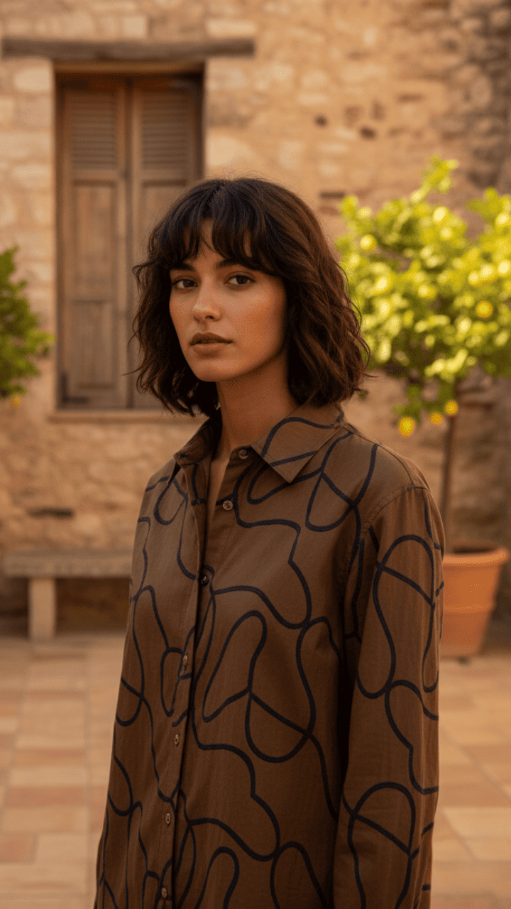 - Cotton All Over Wavy Embroidery Shirt in Brown